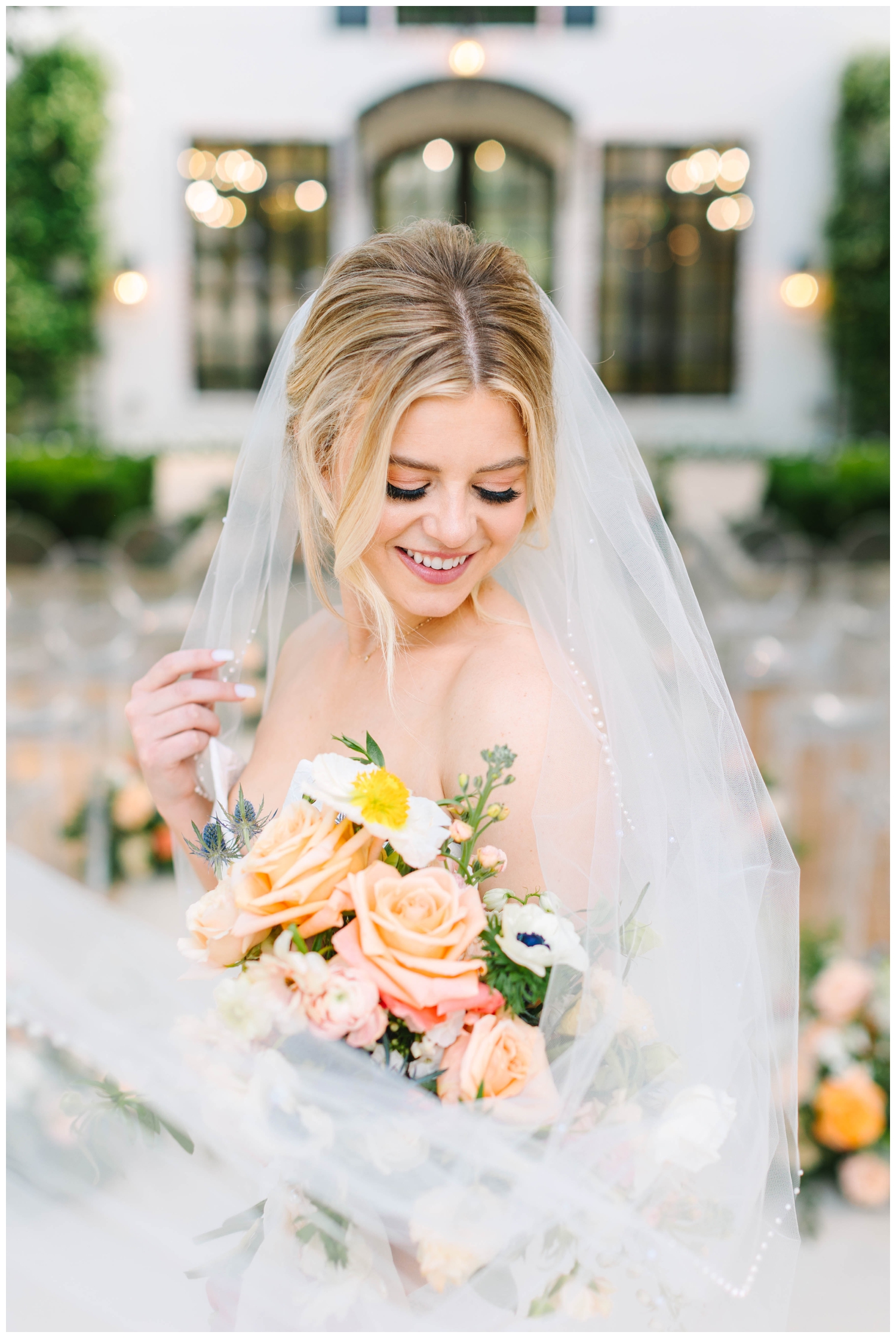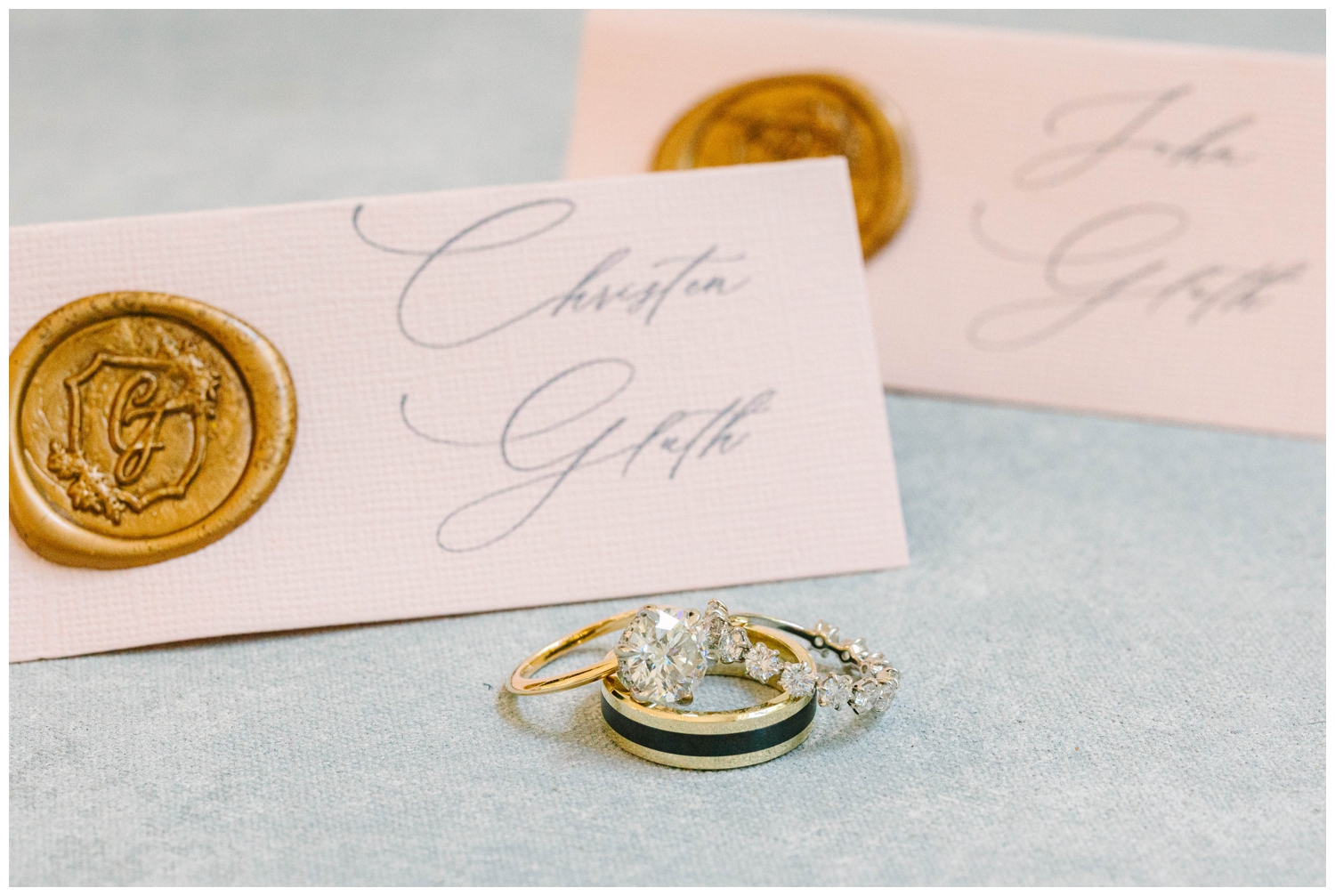 Christen’s favorite colors are the blue and orange that you see in a sunset. She created a dusty blue and orange-y peach color pallet that was gorgeous. The Mohr Collective helped them create an invitation suite that perfectly suited the whimsical French garden wedding vibe. Her bouquet from Piney Rose Florals was extra special as tied in on the bow were rings that were family heirlooms.