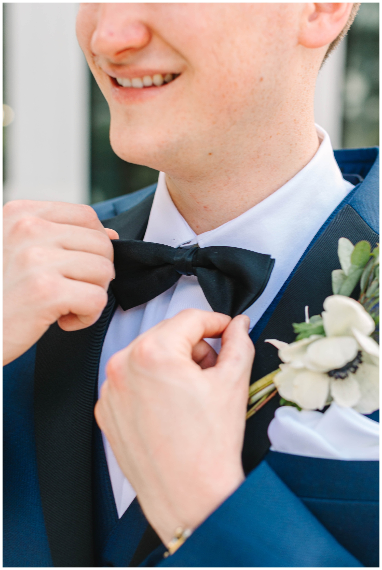 Decked out in a blue tux and black bow tie, John could not wait to see his bride in her wedding gown. With his best friends by his side, he was looking forward to marrying the woman of his dreams.