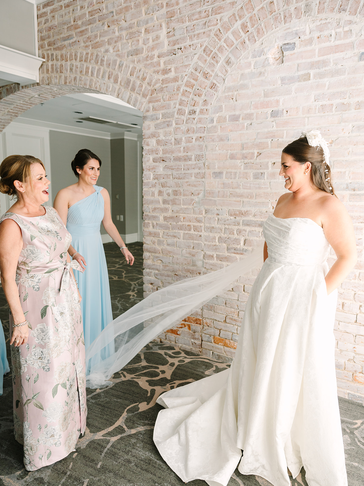 Courtney got ready in one of the dreamy suites at The Tremont House, surrounded by her surrounded by closest girls, lounging in matching striped pajama sets and cozy socks. Her mom helped her into her dress and placed her own wedding veil on Courtney! It was one of those sweet full-circle moments that had everyone (including me) tearing up behind the camera. Then came the first look with Courtney’s dad! The second he walked through the door, his face lit up seeing his daughter as a bride. It was the kind of moment that really grounds you on a wedding day! Reminding everyone what it’s all really about.